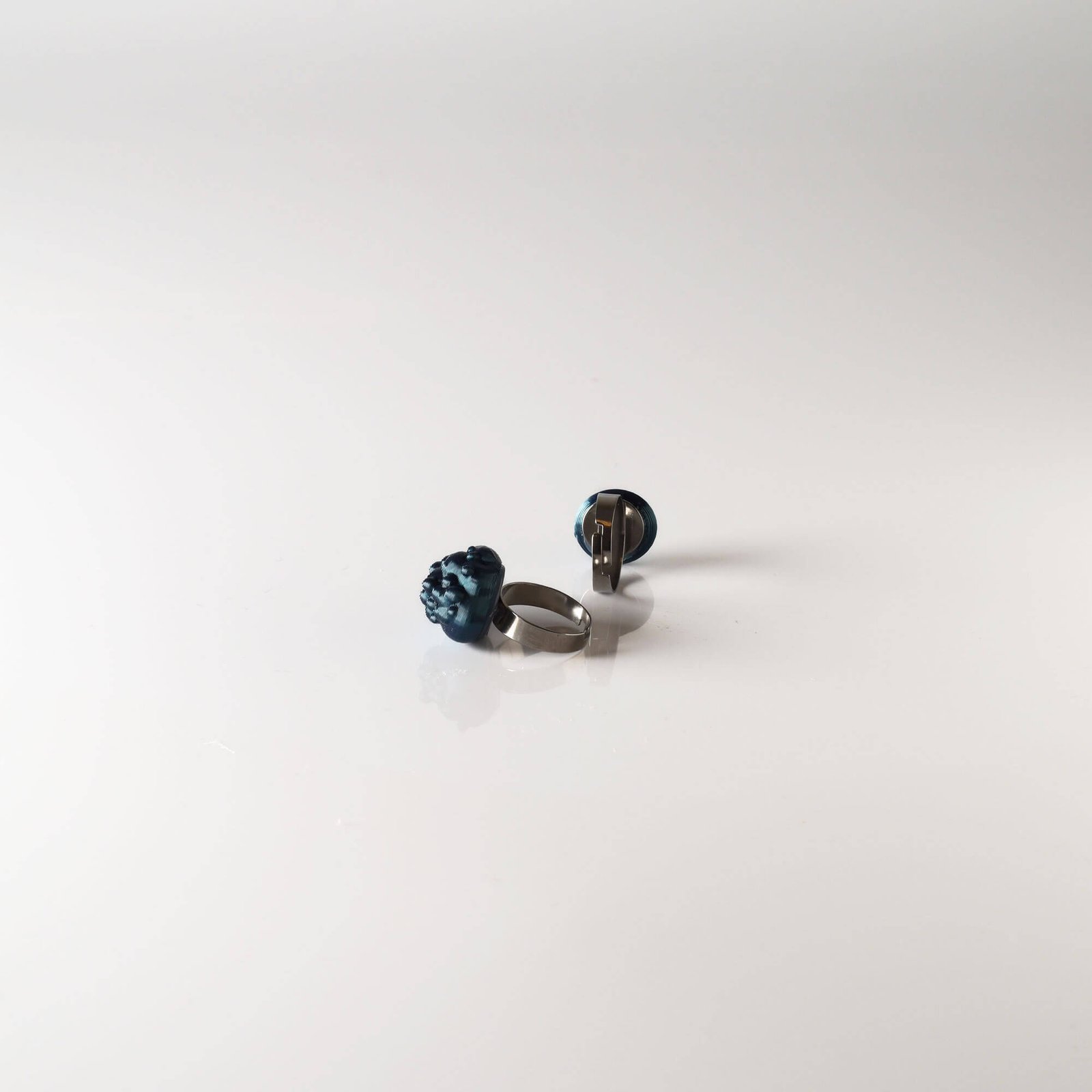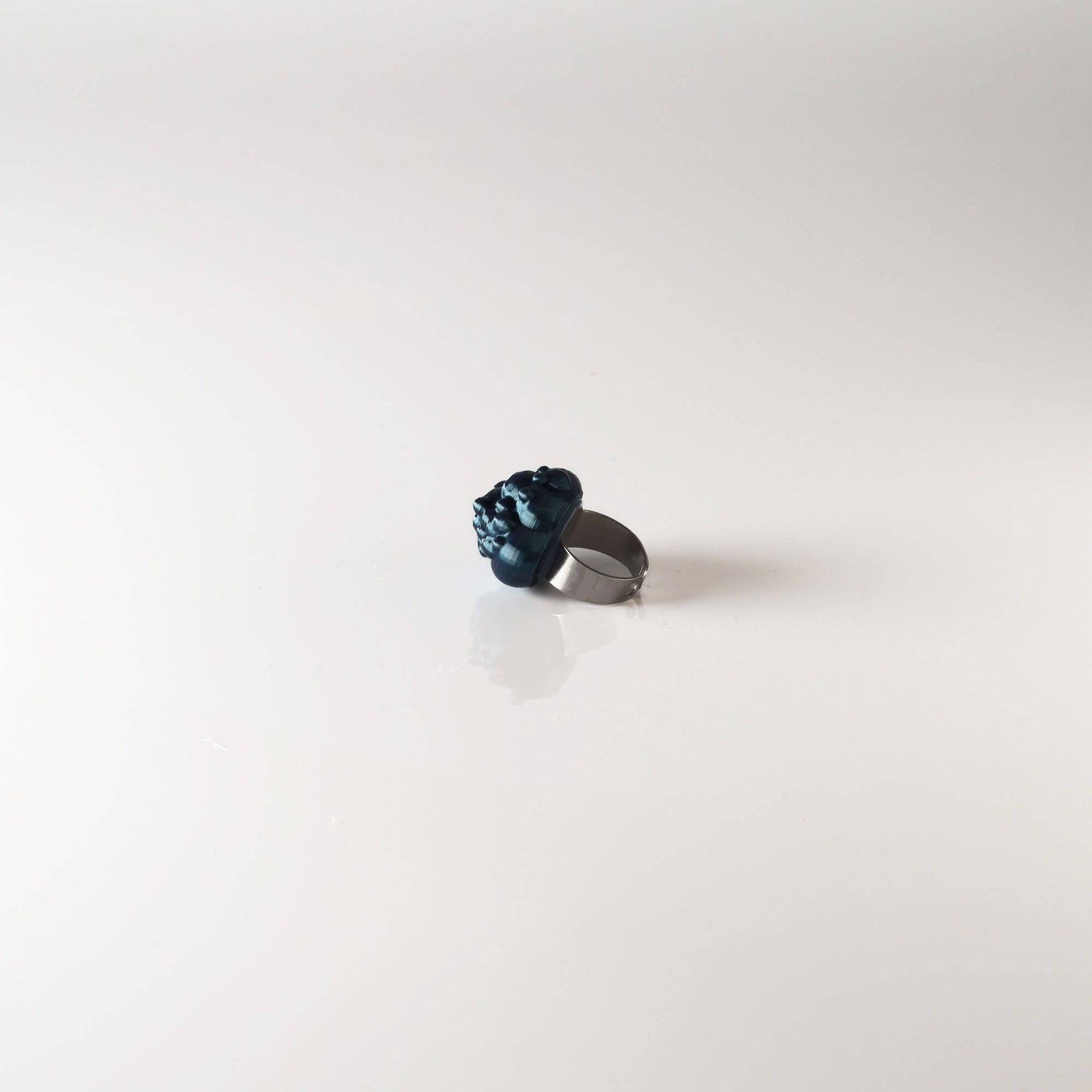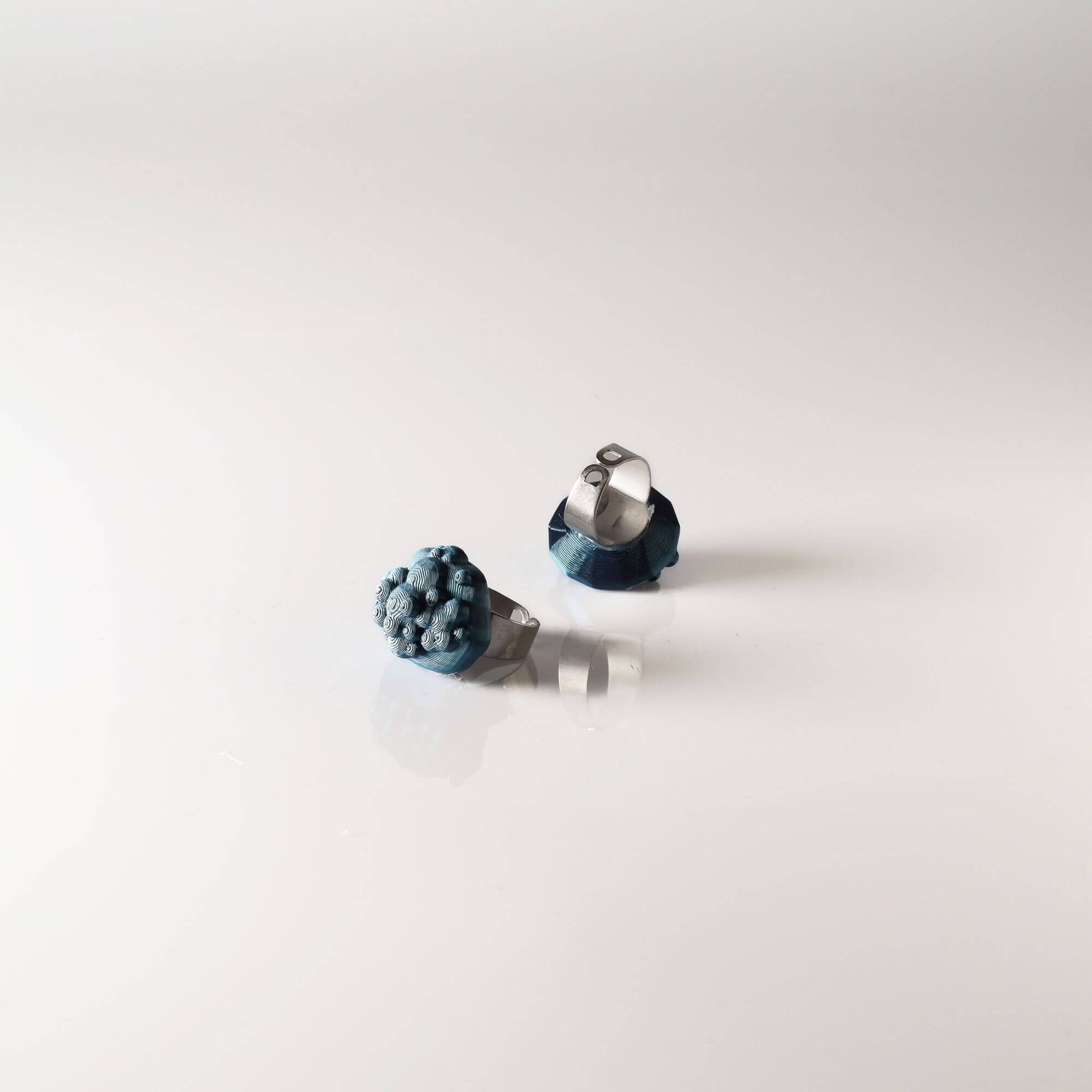 Sky Node brings the energy of open skies into a large bubble ring. Its cyan finish highlights the airy, sculptural shapes, creating a playful yet statement-making piece.
