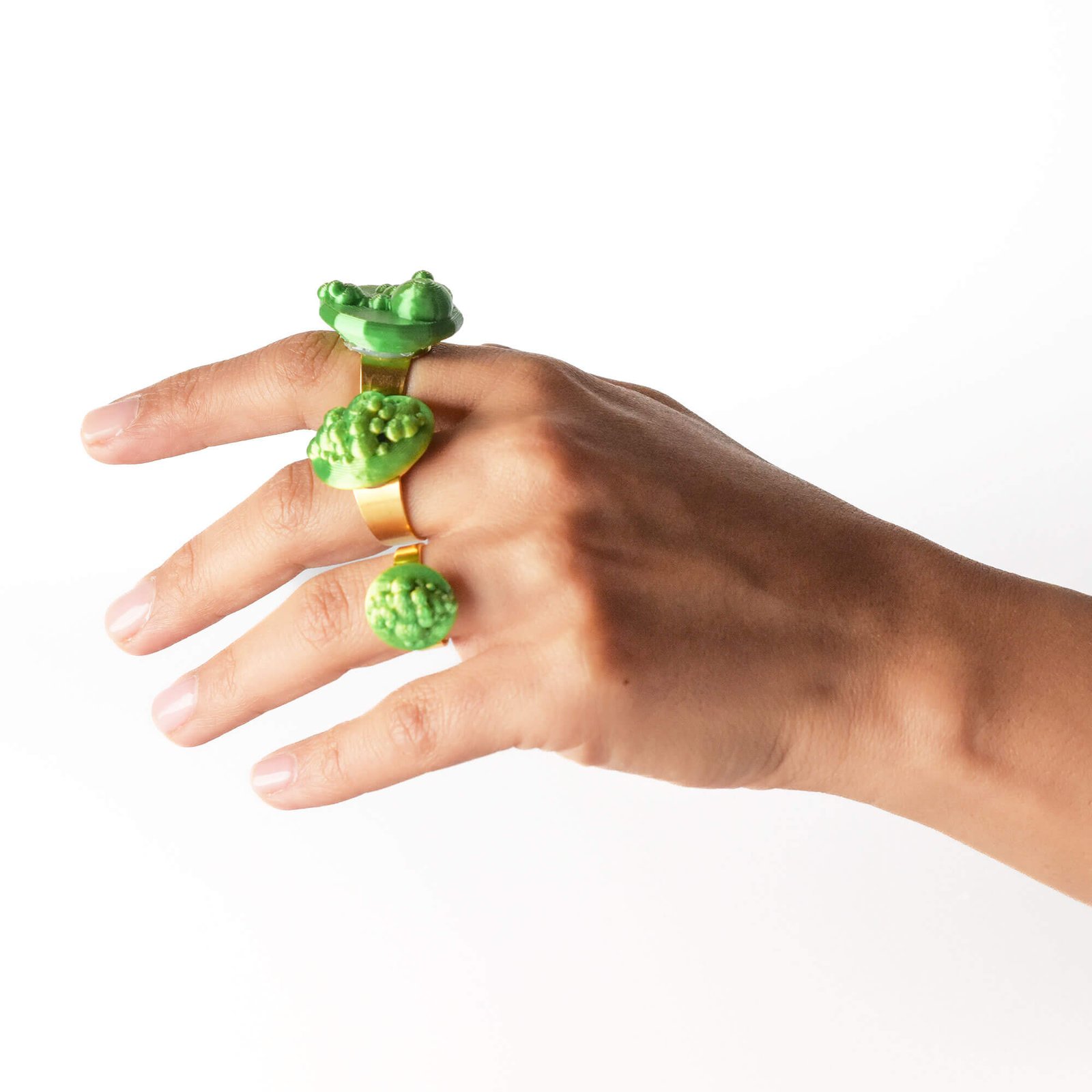 Emerald Orbit — Cup Ring turns tiny iridescent green bubbles into a sculptural highlight atop a diamond-shaped cup. The airy, metallic shimmer gives it a cosmic elegance, playful yet refined.