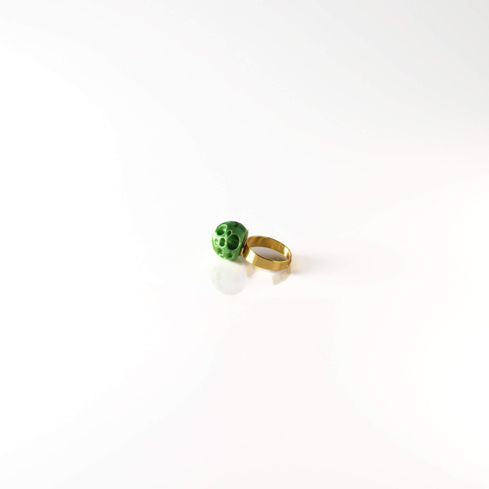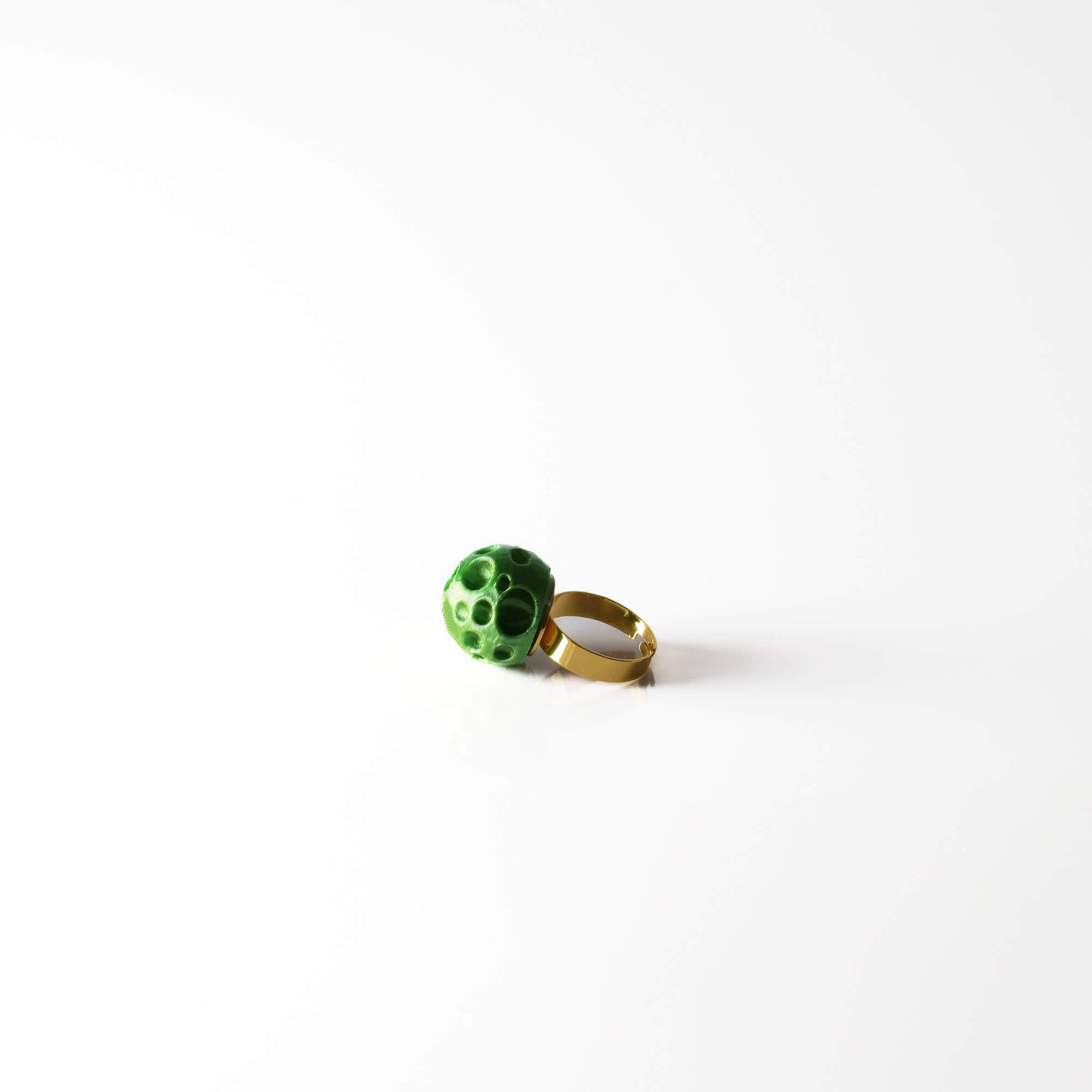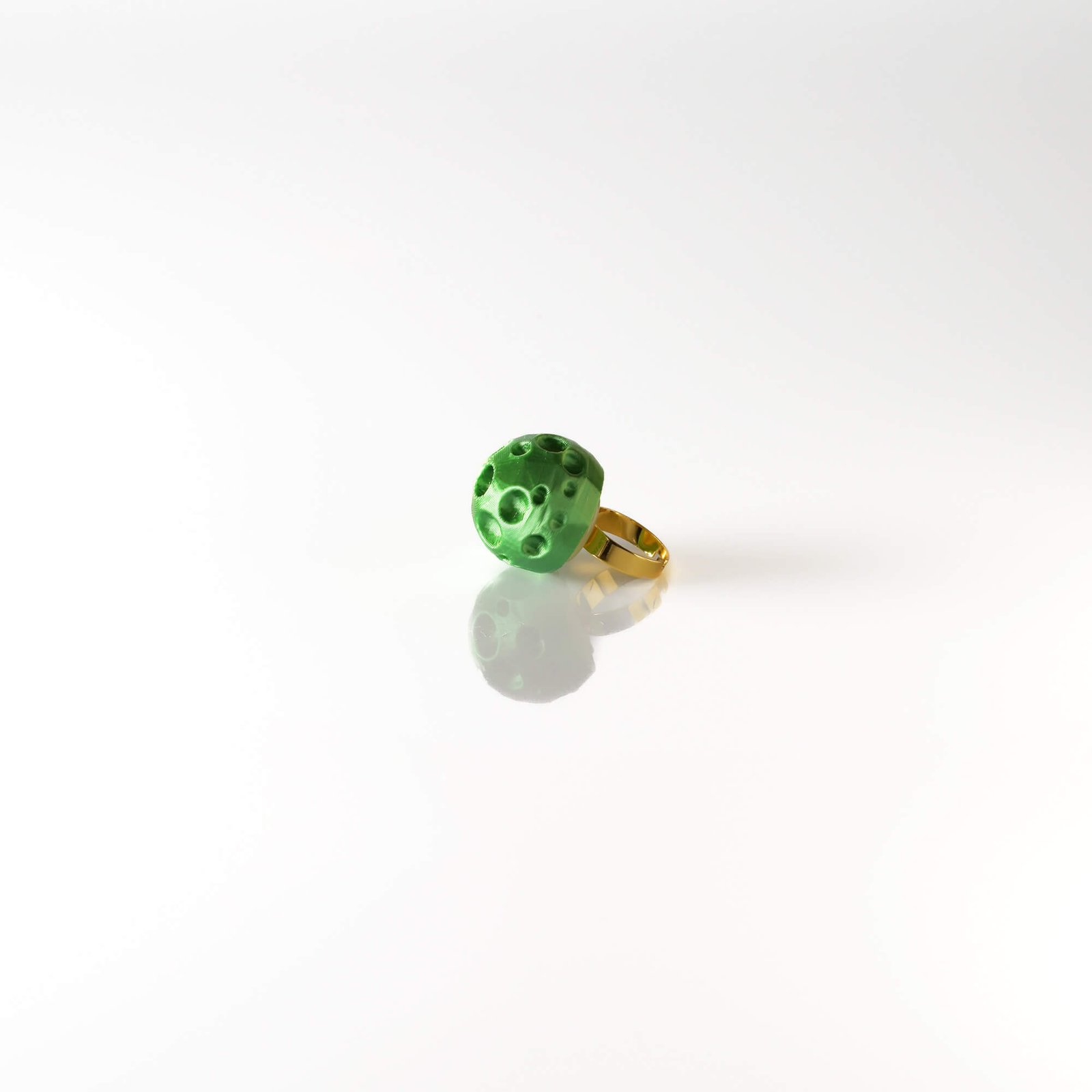 Emerald Orbit captures the movement of light across a complete lunar surface. Its iridescent green finish creates shifting reflections, giving the ring a living, organic presence.