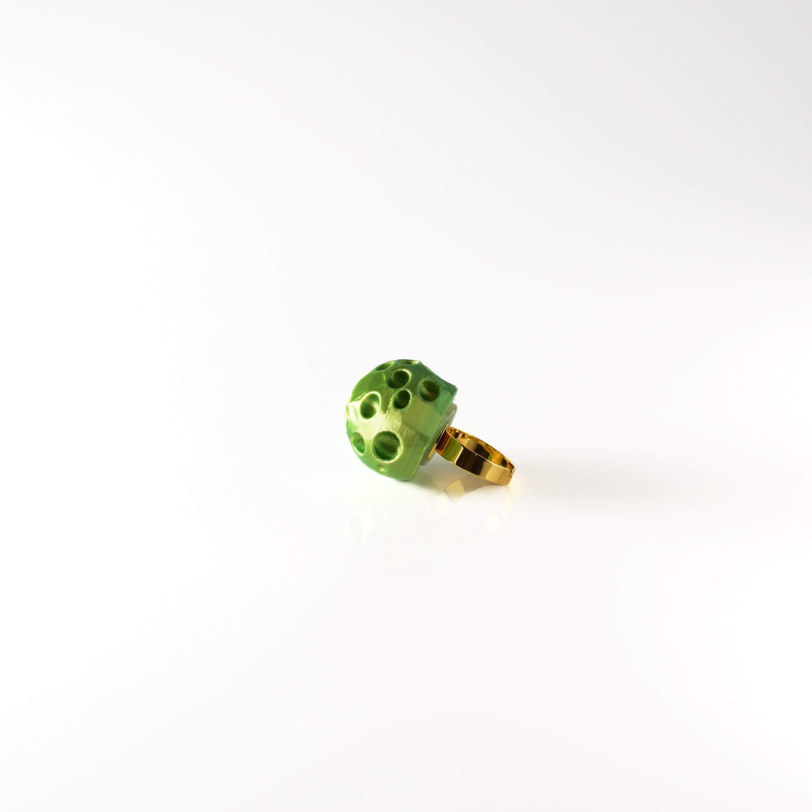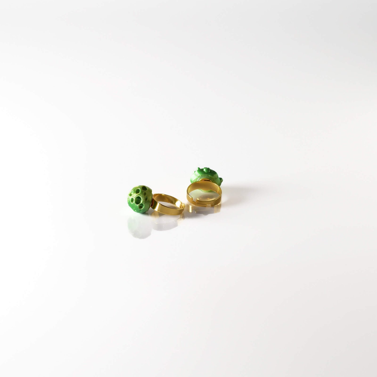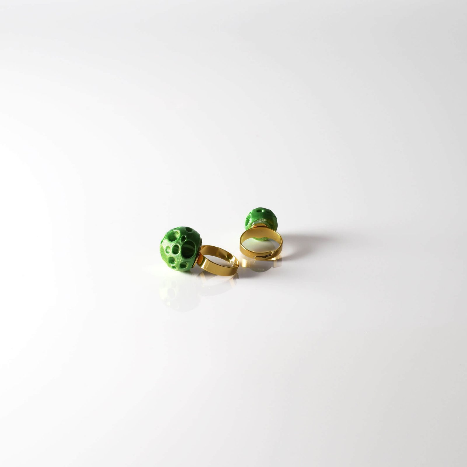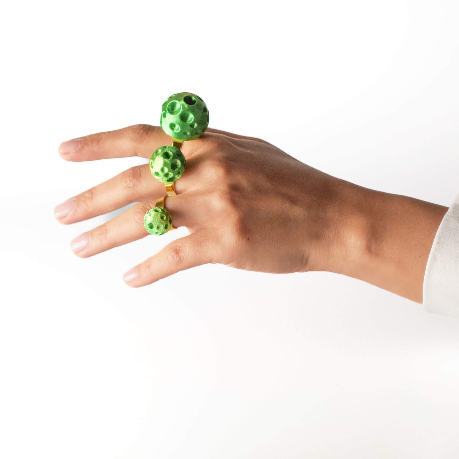 Emerald Orbit captures the movement of light across a complete lunar surface. Its iridescent green finish creates shifting reflections, giving the ring a living, organic presence.