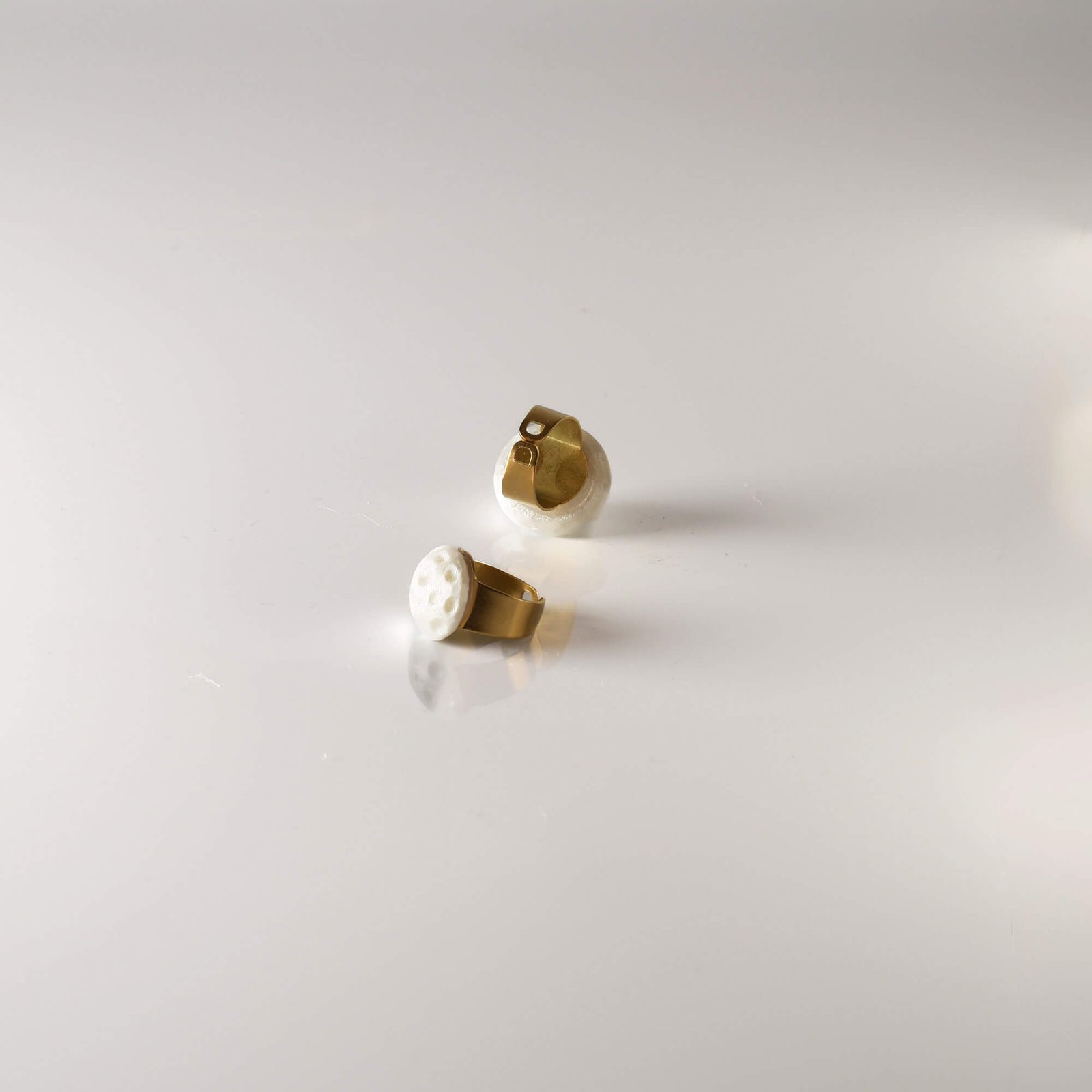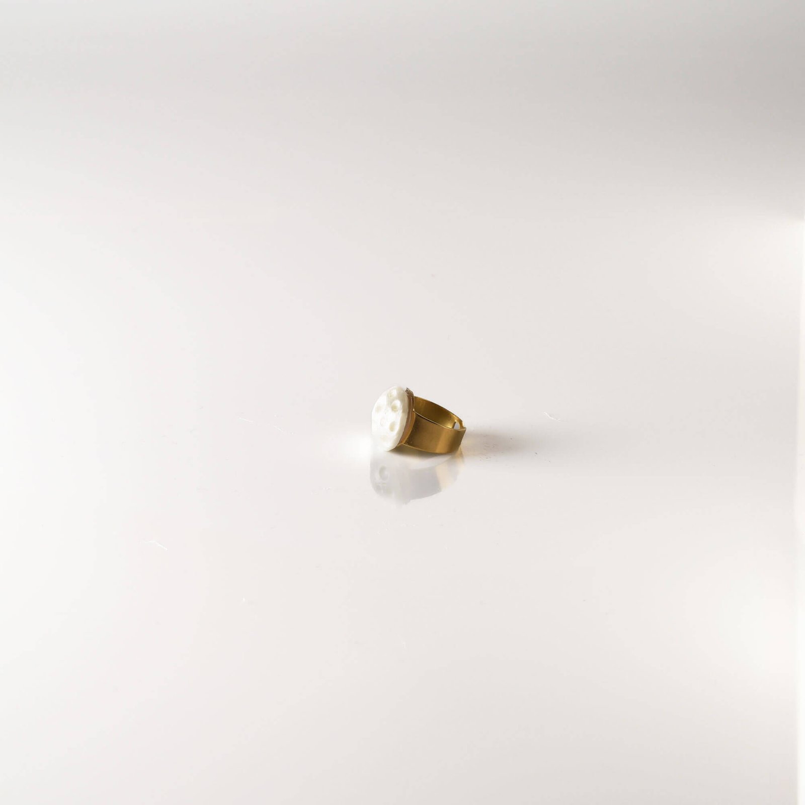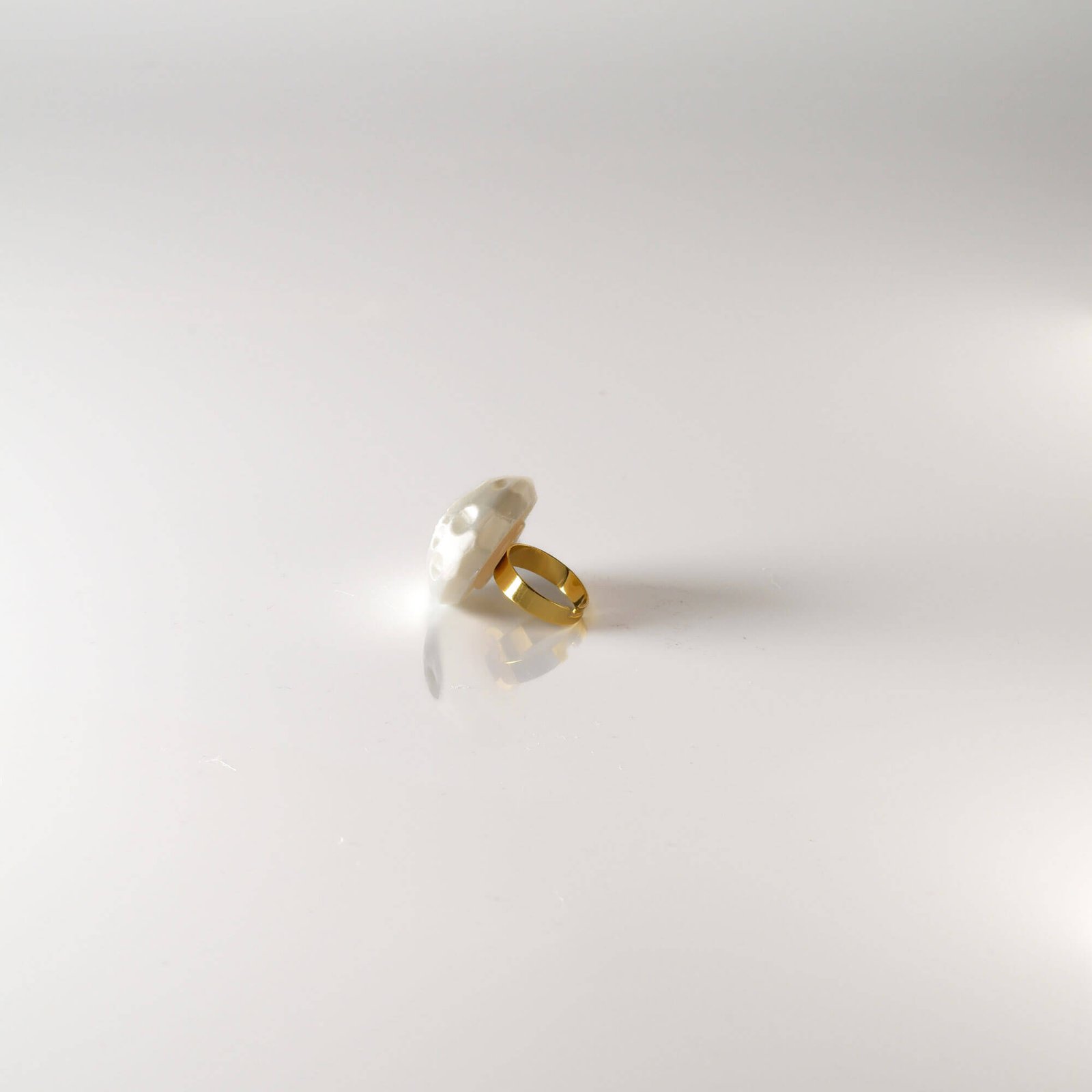 - Sculptural half-moon ring with a luminous white finish