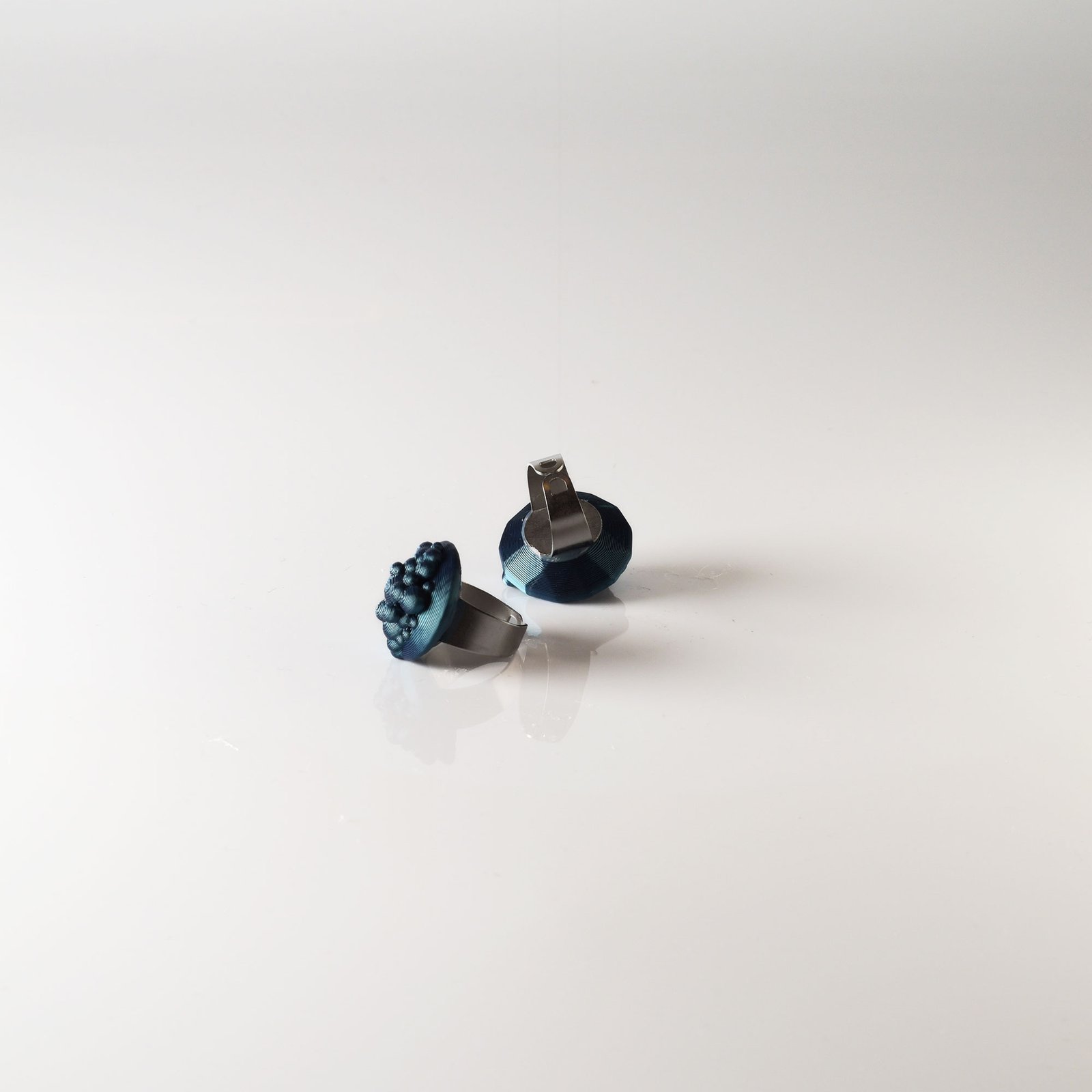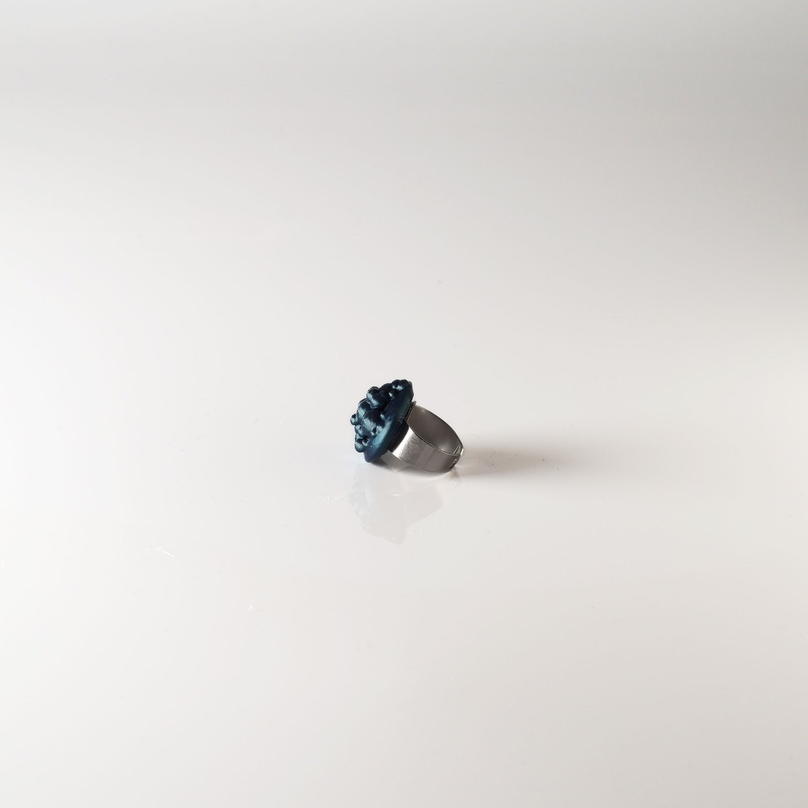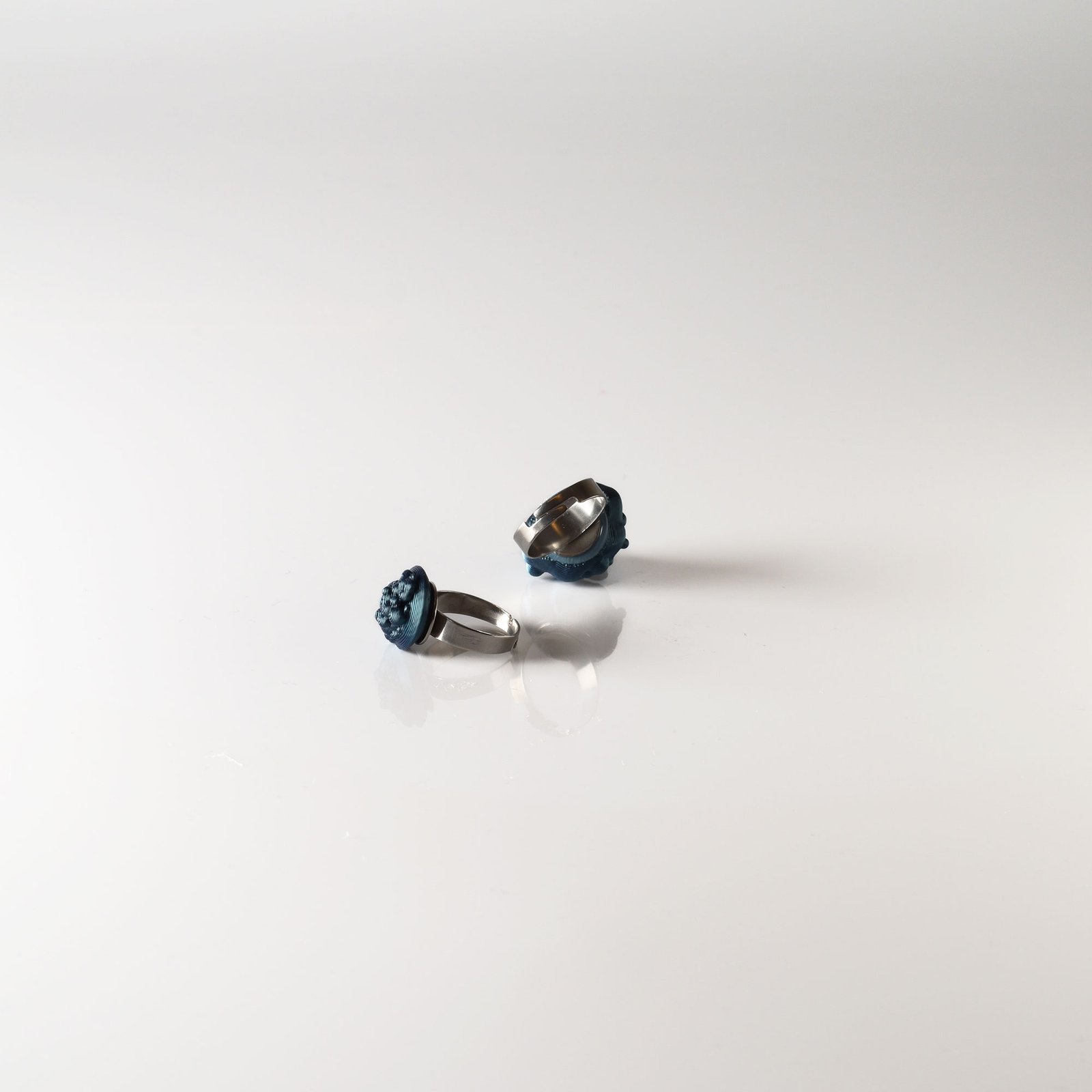 Sky Node evokes the energy of a cosmic sky sprinkled with stardust. Its cyan metallic shimmer enhances the floating, playful geometry of the ring.